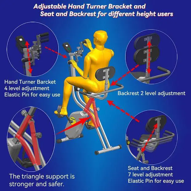 Suitable for Different Height Users: Hand Turner Bracket, soft Seat and Backrest adjusted for different height users. They are used the Elastic Pin for easy adjustment. This exercise machine accommodate from 4' 9" to 6' 3", and MAX weight capacity of 300 LBS