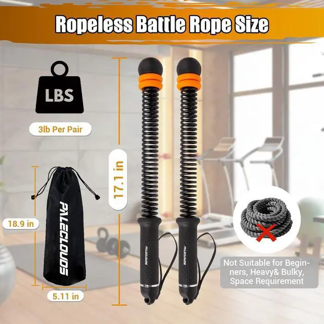 [Ropeless Battle Ropes] Worried that traditional battle ropes are bulky and hard to use, while exercise ropes lack resistance? The upgraded adjustable cordless battle ropes are the ideal solution. Each ropeless workout rope is 17.1 inches long, and 3 lbs for each pair. With two adjustable rubber weight rings, you can easily change the intensity. From beginners to fitness professionals, all are suitable for the HIIT strike ropes and can enjoy an efficient workout while using them.