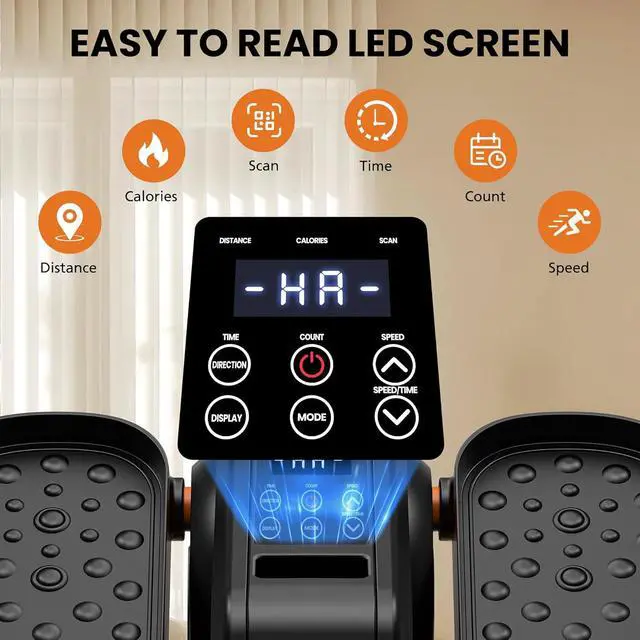 LCD Display with Remote Control: This portable elliptical exercise machine features an LCD screen, you can track speed, distance, reps, time, and calories burned in real time. Pedal exerciser for seniors feature with thoughtful remote control allows you to change mode without bending over, reducing strain on your back. (Note: 2* 1.5V AAA Batteries for the remote control are not included and must be purchased separately. )