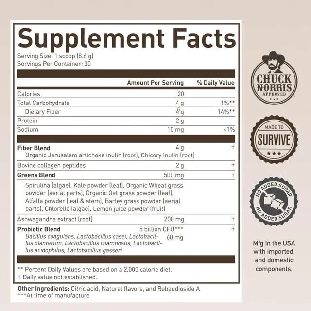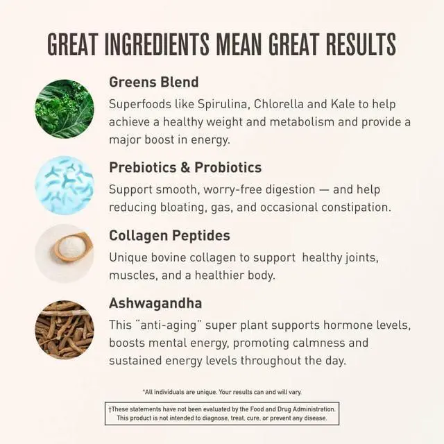 Powerful Greens: This powerful greens and superfood powder was formulated with probiotics to help support gut health. Ashwagandha to support brain function and help manage stress, and collagen to help protect joints. *