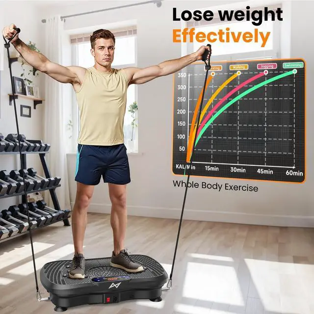RICH FUNCTIONAL & HIGH EFFICIENT& REMOTE CONTROL: Adjustable vibration speed (1 to 120), with 2 resistance workout bands, can exercise upper body and lower body at the same time. Offering variety of exercise modes, allow you to try different vibration exercises, With this workout machine, you can have your routine exercise done in only 10 minutes everyday. What youll get is a better shape and enhanced metabolism, increased bone mineral density, relieve and reduce stress levels.