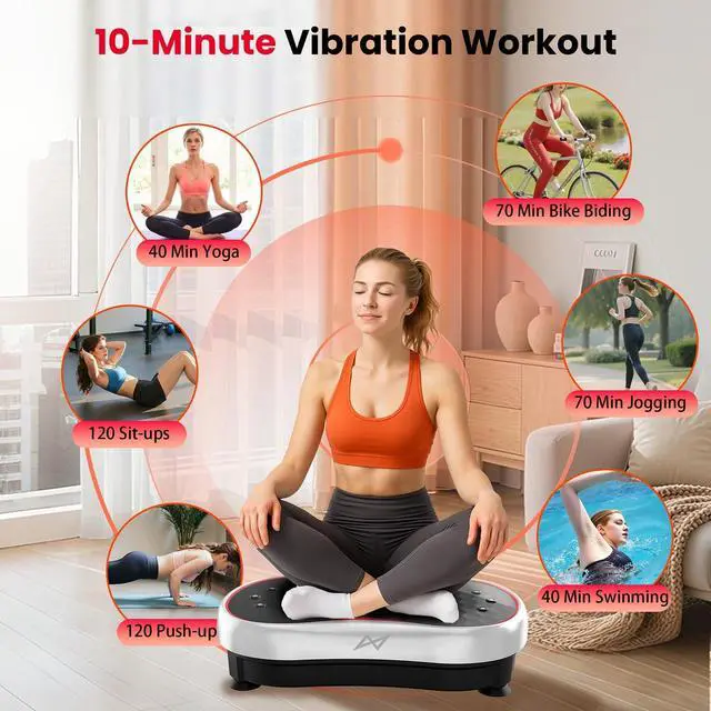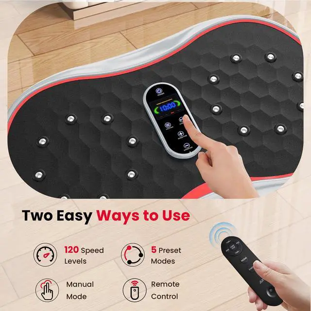 RICH FUNCTIONAL & HIGH EFFICIENT& REMOTE CONTROL: Adjustable vibration speed (1 to 120), with 2 resistance workout bands, can exercise upper body and lower body at the same time. Offering variety of exercise modes, allow you to try different vibration exercises, With this workout machine, you can have your routine exercise done in only 10 minutes everyday. What youll get is a better shape and enhanced metabolism, increased bone mineral density, relieve and reduce stress levels.