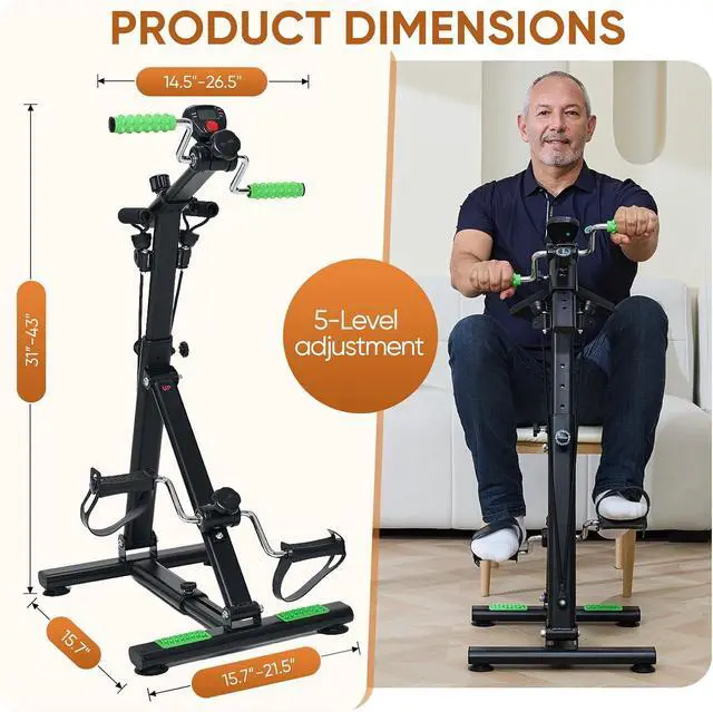 Adjustable DesignArm and leg exercise bike features adjustable tension and height, Featuring 5-level adjustable height at the handle and center pillar ( 31' ' - 43" of total height), stepless adjustment at the base ( 15.7 ' ' - 21.5 ' ' of base length), offering a safe, low-impact workout for arms and legs while sitting.