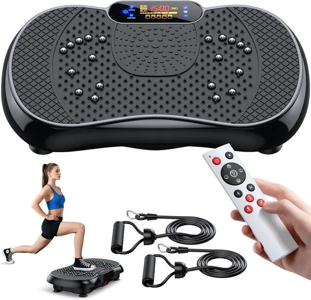 AUTO MODE FOR EFFORTLESS WORKOUTSAutomatic mode offers 5 intensity settings with varying grades & frequencies (P1-P5). Simply press the P button to enter auto mode and start exercising. The vibration plate comes with 2 resistance bands to enhance full body exercising, effectively burning calories and toning muscles. Just 15 minutes of daily exercise could promote metabolism, relieve and reduce stress.