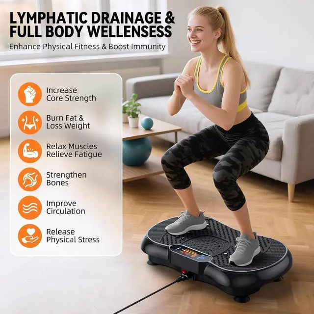 SAFETY DESIGN& EXCELLENT QUALITYFeaturing four non-slip suction cups on the base stabilize the vibration plate, preventing slipping and reducing noise during exercise. The non-slip surface & impact-resistant ABS casing protect the motor and enhancing long-term durability. It supports a maximum weight of 330 pounds.