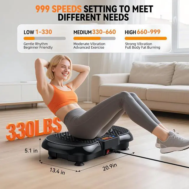 SHAPE YOUR IDEAL PHYSIQUEStep onto this waver vibration plate to embrace the ease of home fitness and get into your ideal shape. Adjust the intensity from 1-999 speed settings, with three preset mode (Walking, Jogging and Running) and M button (200, 400, 600.800 ) setting. Personalized workout settings help you burn more calories efficiently, tone your body and achieve your fitness goals