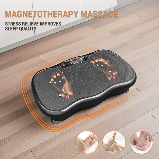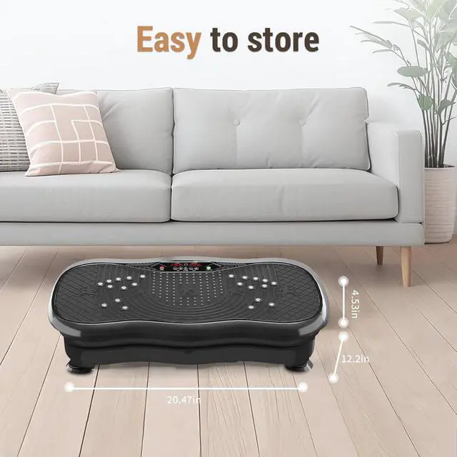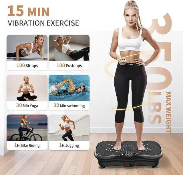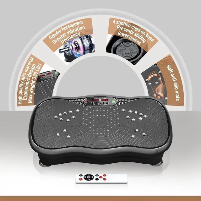DURABILITY AND STABILITYVibrating plate exercise machine features a quality ABS housings and four non-slip suction cups to assure stability and security Period intense workouts. Effectively reduces noises and has a maximum weight capacity of 330 lbs, Suitable for most fitness enthusiasts