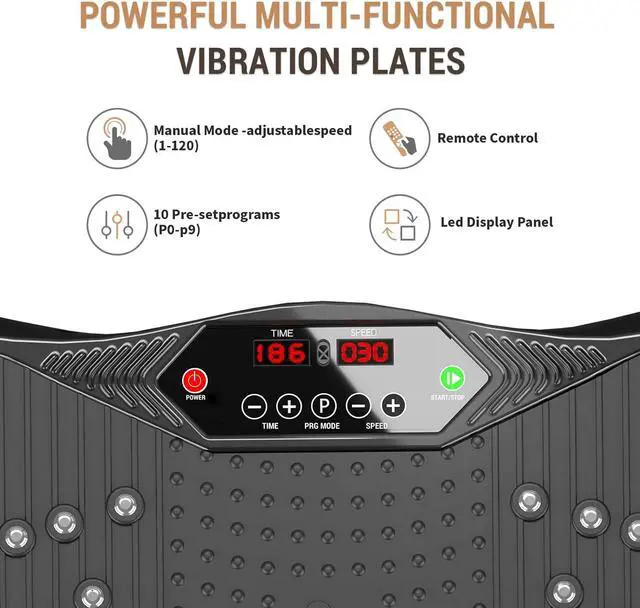 EASY TO USEThe vibration plate offers two modes, automatic modes (P0-P9) the P button to start your workout. Manual modes allows you to adjust the vibration speed (1 to 120) and times(1-20) minutes, as well as multiple shortcut keys. Lets you try different vibration workouts