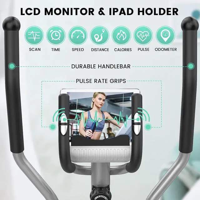 Pulse Sensors & LCD MonitorDripex elliptical training machines is designed with dual handlebars; the fixed heart rate grip features built-in pulse sensors that monitor your heart rate in real-time during exercise. The LCD digital monitor can real-time track and scan your exercise data, including time, speed, distance, calories, pulse, and odometer. You can create your exercise routine based on your workout progress. The device holder allows you to watch videos or enjoy music when you exercise