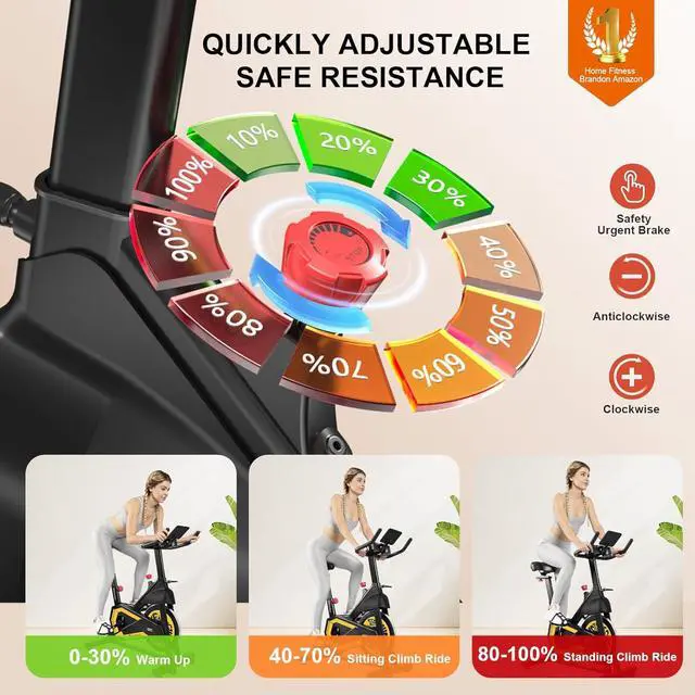 & Comfortable Ride: Crafted with a heavy-duty steel frame and 13.5 lbs flywheel, this stationary exercise bikes delivers a smooth, quiet, and stable rideideal for home use without disturbing others. Designed for all fitness levels, it features adjustable resistance, a multi-grip handlebar, shock absorption for added comfort, and safety-enhancing cage pedals with an instant stop bar. Dual water bottle holders and built-in transport wheels make every workout safe, convenient, and effective.