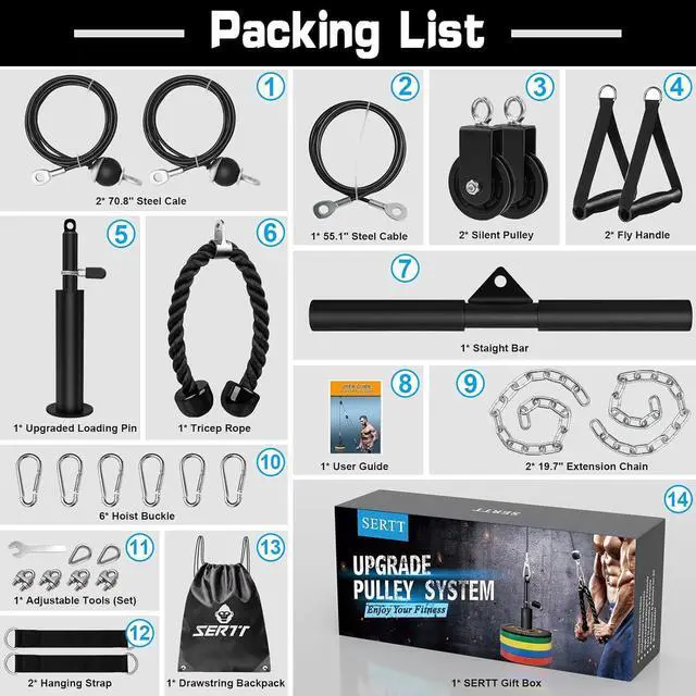 Upgraded Value Kit and More Exercises Choice The SERTT Lat Pulley System kit has 2 pulleys and more cable machine accessories than others gym pulley system sets, allowing you to flexible DIY and choose your own way to do various exercises, such as Biceps Curl, Triceps Pull Down, Lat Pull Down, Row, Fly and etc.