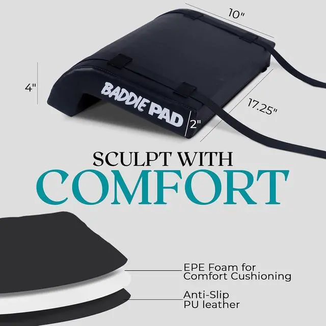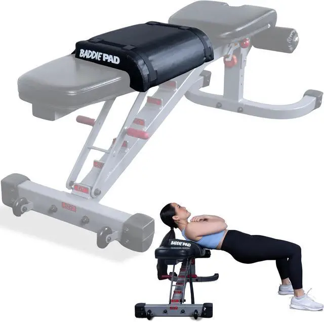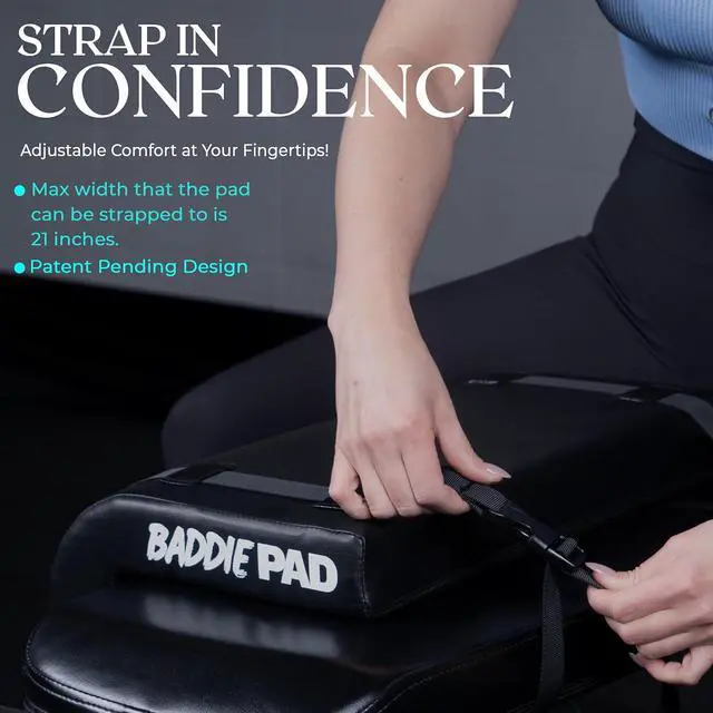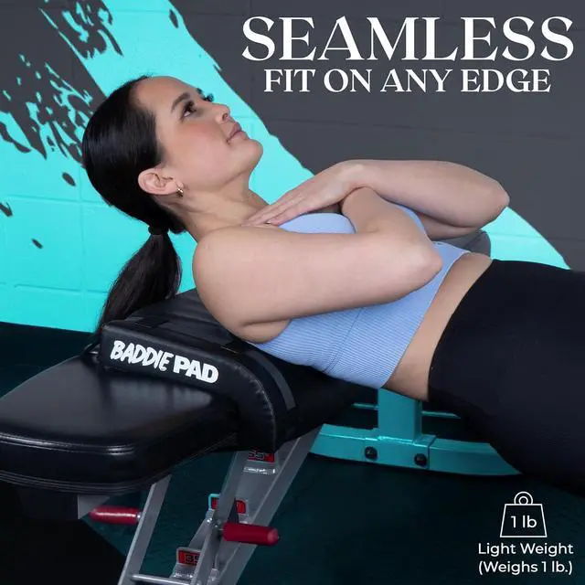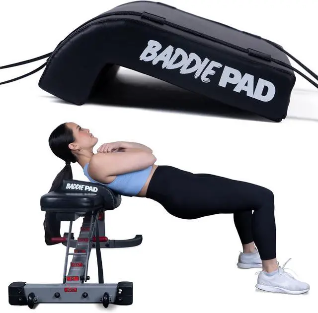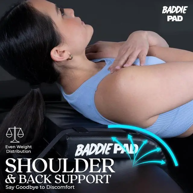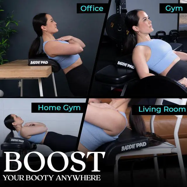 The Baddie Pad can be used on a firm edge surface with a weight bar to perform comfortable hip thrusts with no need for a hip thrust machine, hip thurst bench or hip thurst box, use with a weight bar or hip thrust belt