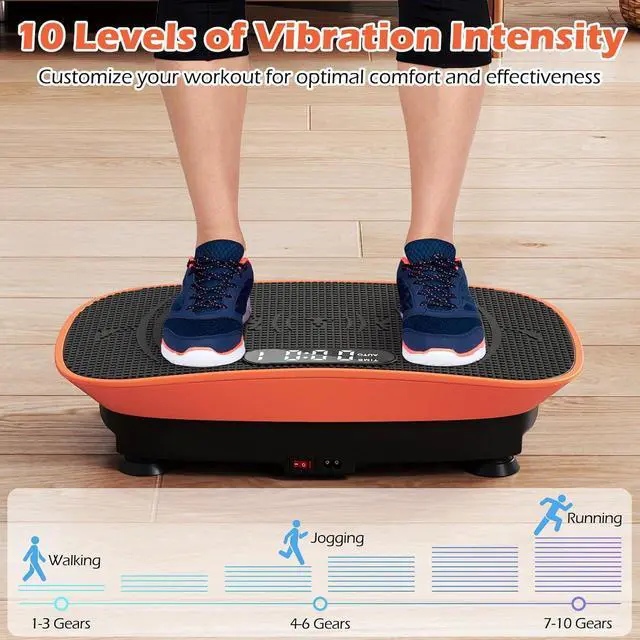 Manual & Auto Modes The body shaker machine features 10 levels of vibration intensity to match your pace, where gears 1-3 simulate walking, 4-6 jogging, and 7-10 running, while the convenient auto mode seamlessly adjusts speeds within 10 minutes for a dynamic and personalized fitness platform.