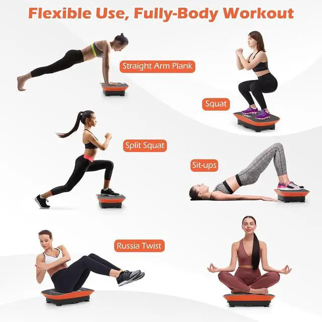 Ultra-Efficient Fat Burner This small curved vibration platform machine delivers an incredible workout efficiency, where just 10 minutes of use equals 30 minutes of yoga, 100 sit-ups, 100 push-ups, 1 hour of biking or jogging, and 30 minutes of swimming, making it the perfect solution for rapid fat burning in your fitness journey. Moreover, it could achieve full-body workouts, including straight arm planks, split squats, squats, sit-ups, and Russian twists on the versatile stand shake plate.