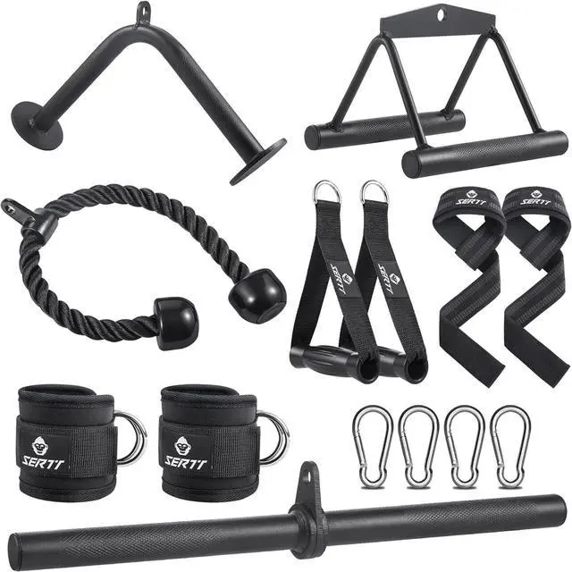 What You Get 1*V-Shaped Bar + 1*Rotating Straight Bar + 1*V-Double D Handle + 1*Tricep Rope +2 *Ankle Straps + 2*Cable Machine Handles + 2*Lifting Wrist Straps + 4*Snap Hooks. Besides, all SERTT Brand Products will be backed by our 12-month Free Replacement Warranty and support 7*24h Technology Service. Just feel free to contact us if you have any question.