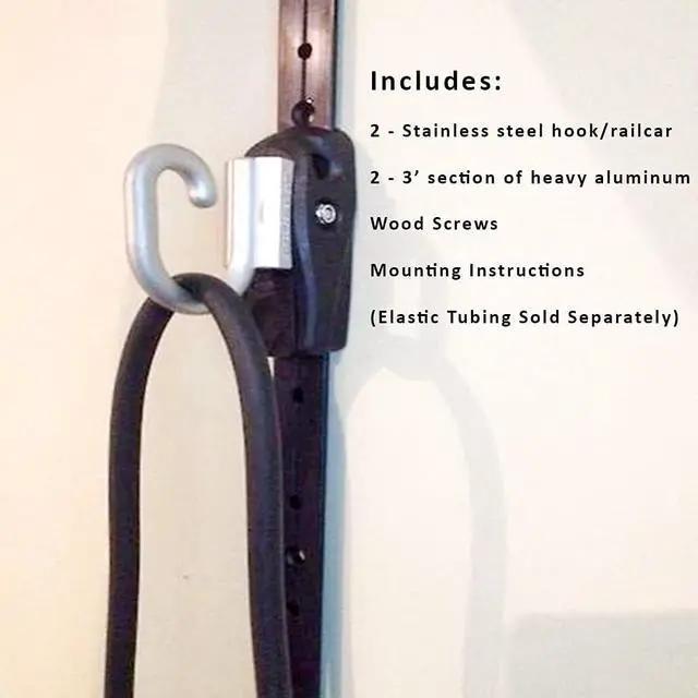 Complete Installation Kit Included 2 stainless steel hooks/rail cars, 2 aluminum mounting brackets/rails (3 ft each), 4 rubber washers, 2 sets of 10 screws, and installation guide. Requires drill, level, and Phillips screwdriver.