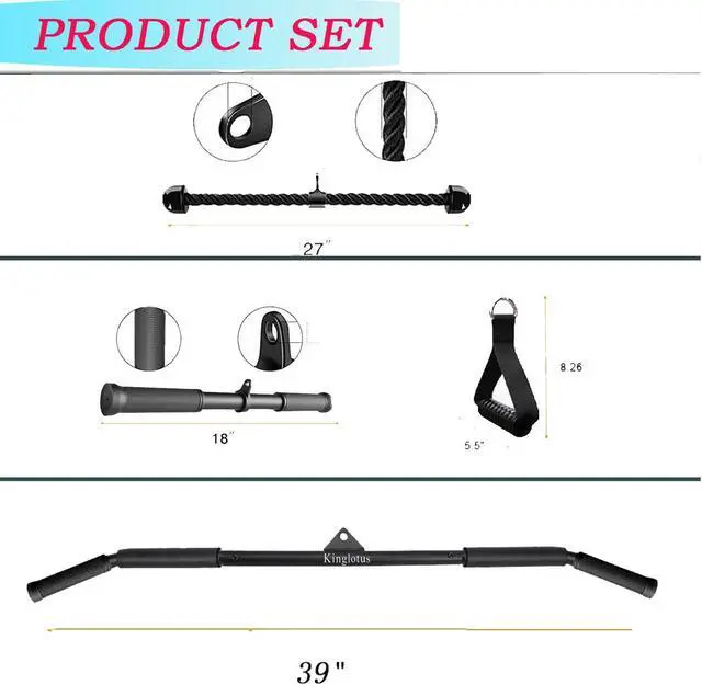 Professional Components & Enough Safety: 1 x 39-inch pull down bar, 1 x straight swivel pull down bar, 1 x tricep rope, 2 x sport grips, 2 x locking clips, universal design fits most cable systems