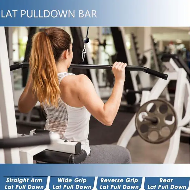 Straight rotating pull down bar: 17 inches long, very comfortable rubberized grip provides better grip. Ideal for performing pull downs, triceps press downs, upright rows, straight bar curls, seated rows