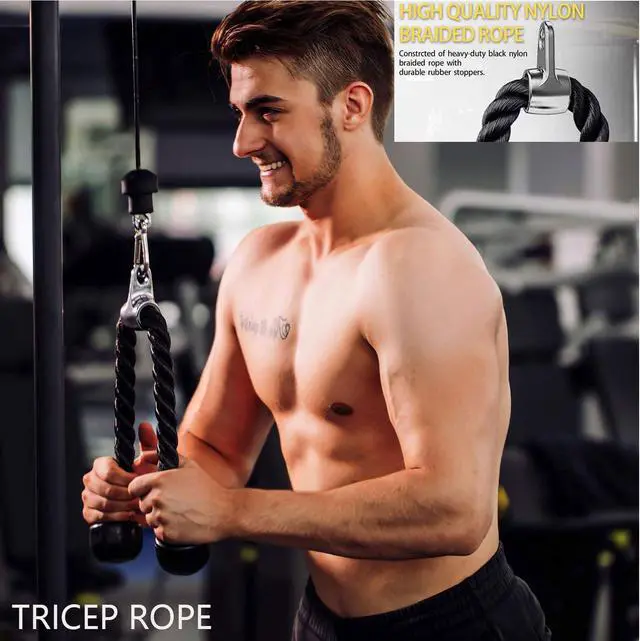 Nylon Braided Tricep Rope: Made of heavy-duty black nylon braided rope with solid rubber ends and chrome-plated swivel attachments provide smooth rotational motion.