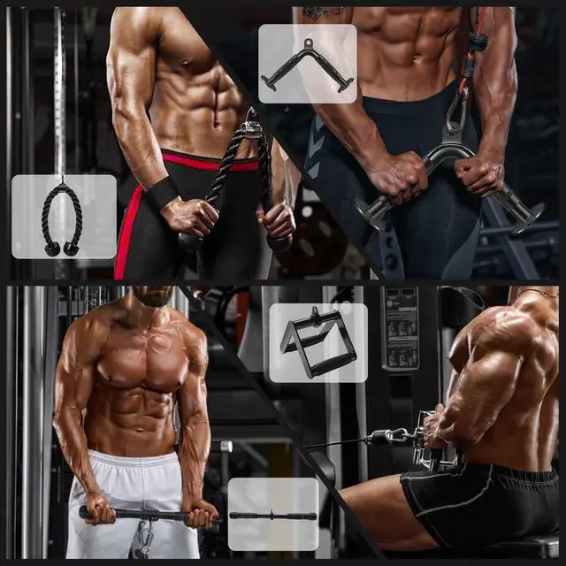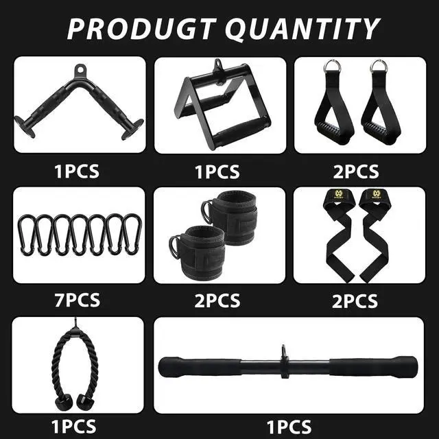 WHAT IS IN THE BOX - 1 * V-Shaped Bar +1 * Straight Rotaing Bar + 1 * V Handle with Rotation + 1* Nylon Braided Tricep Rope+2 *Ankle Straps+ 2*Cable Machine Handles+ 7*Snap Hooks+ 2*Lifting Wrist Straps.