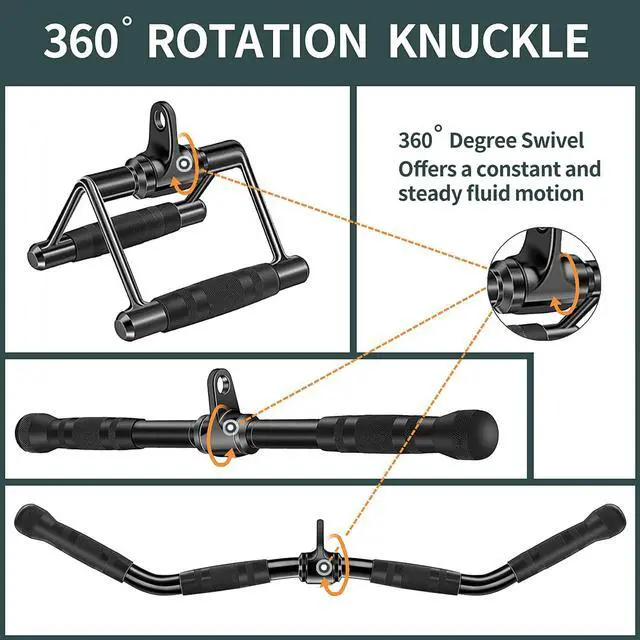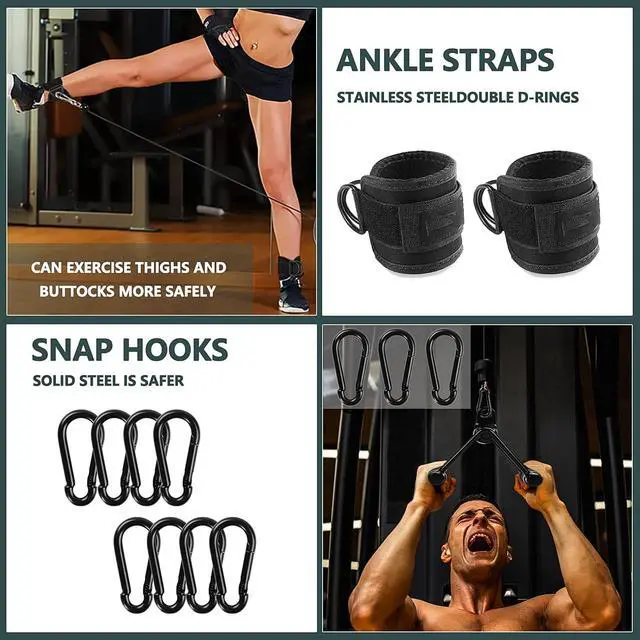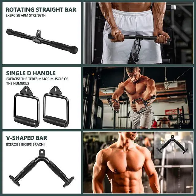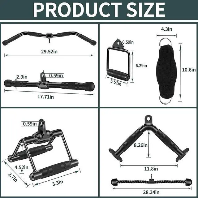 Includes: 1x 29.52 inches Lat Pull Down Bar, 1x Tricep Rope, 1x Double D Handle, 1x V-Shaped Bar, 1x Straight Rotating Bar, 2x Single D Handle, 2x Ankle Straps, and 8x Snap Hooks. These home gym accessories for men and women are designed to fit most cable systems.