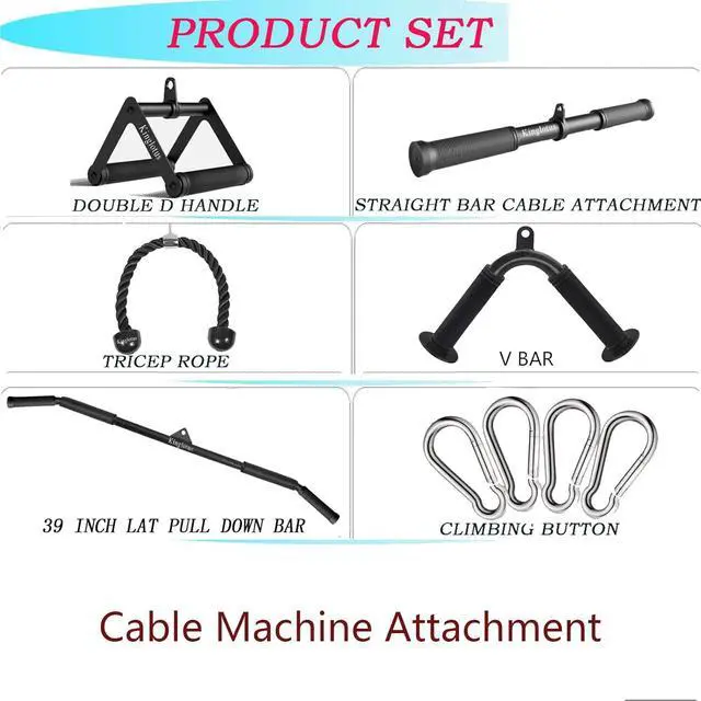 Ultimate Fitness Companion: 1*Curl Pull Down Bar, 1x V-Handle (Double D Handle), 1x V-Shaped Bar, 1x Straight Rotating Pull Down Bar, 1x Tricep Rope, 4x Carabiner Clips, These home gym accessories for men and women are designed to fit most cable systems