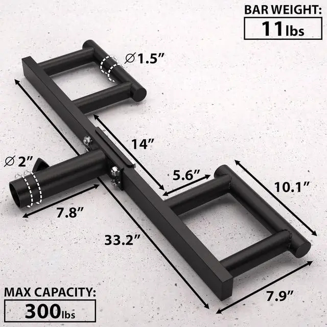 WHATS IN THE PACKAGE The Viking Press Bar is 33.2 long, 7.9 wide, and attaches to your barbell with a 7.8 long tube that is 2 in diameter. The handles are 1.5 in diameter and the two handle blocks are spaced 14 apart. Max weight capacity is 300 lbs.
