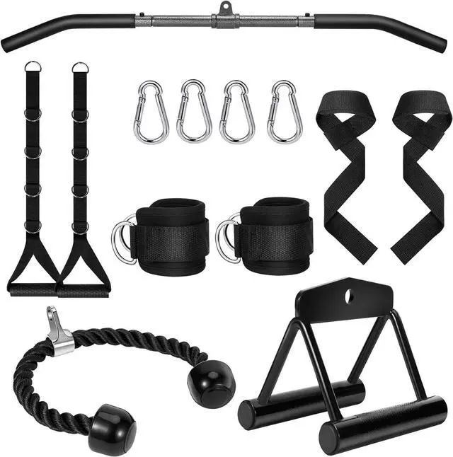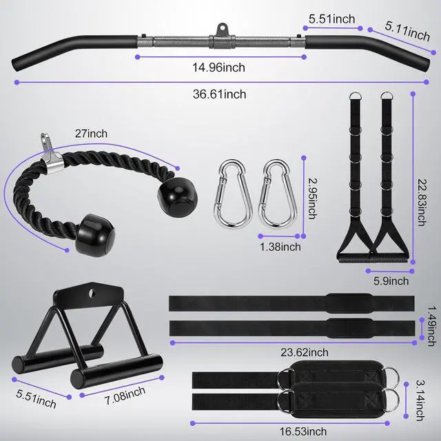 Cable Machine Attachment Set: Deliver premium quality with Q235 alloy steel construction. Includes lat pull down bar, double D handle, nylon braided triceps rope, two cable machine handle, four snap hooks, two gym ankle straps and two weightlifting straps