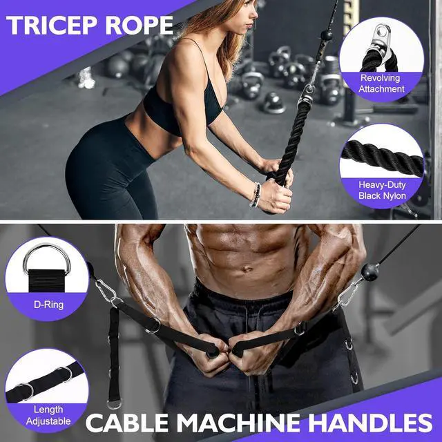 Tricep Rope And Cable Machine Handles: Made of heavy duty black braided nylon cord, large plastic blocks for gym rope attachment to prevent slipping. Different other resistance band handles, can be flexibly adjusted to choose prefer length for training