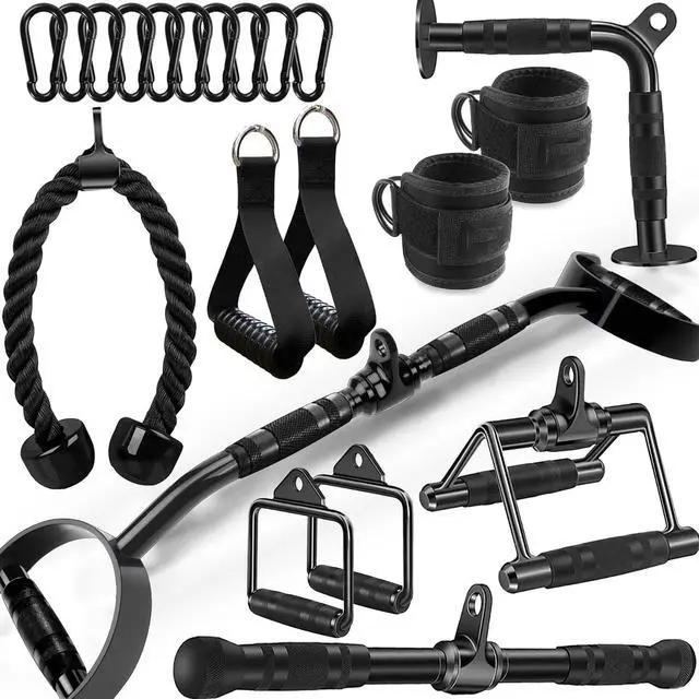 Includes: 1xGrip Lat Pull Down Bar, 1x Tricep Rope, 1x V-Handle (Double D Handle), 1x V-Shaped Bar, 1x Straight Rotating Bar, 2x Single D Handle, 2x Cable Machine Handle, 2x Ankle Straps, and 8x Snap Hooks. These home gym accessories for men and women are designed to fit most cable systems.