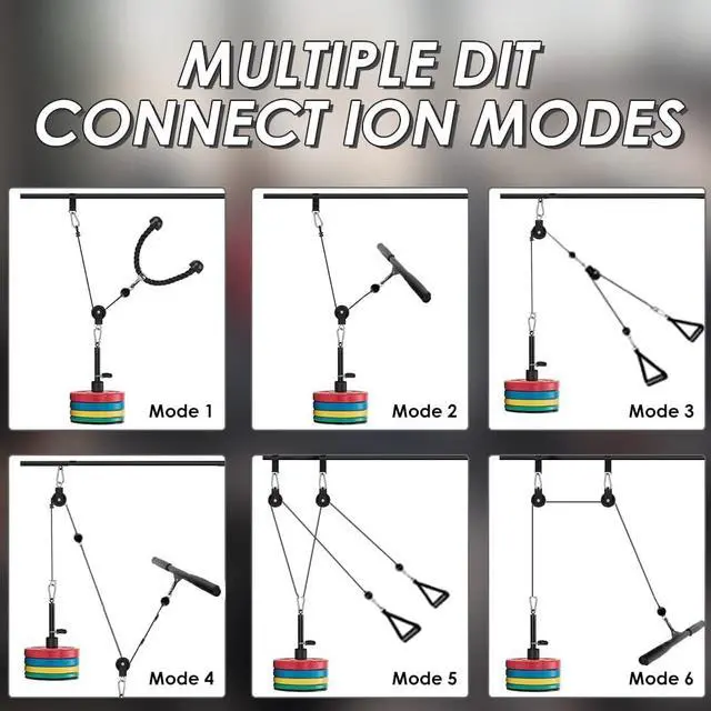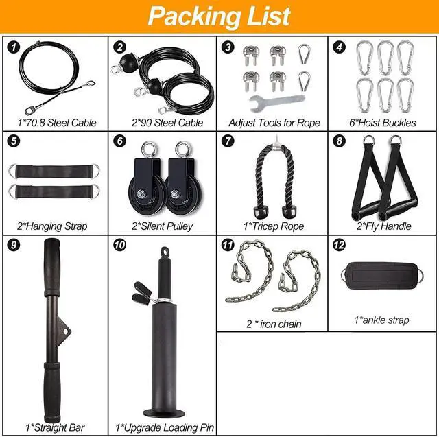 Professional Kit & Multiple ModesThe gym pulley system kit has 2 pulleys, 3 cable, lat pull down bar and other weight pulley system gym accessories. Upgrade cable pulley attachments for gym allowing you the flexibility to DIY exercise pulley patterns and choose the way that suits you for a variety of workouts, and multiple exercises, you can train the biceps, triceps, shoulders and Back Such as Biceps Curl, Lat Pull Down, Row, Fly and etc.