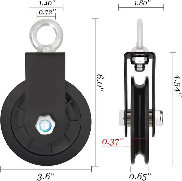 BESTEEL Upgraded Gym Silent Pulley - 360 Degree RotatableThe fitness traction pulley with ergonomic design, it equipped with a rotatable top ring, which is connected with the sheet metal hole through a self-locking nut, which can rotate freely in 360 degrees, safe and solid, and can prevent the wire rope/cable/rope from knotting to ensure safety. The smooth roller makes the rope movement more smoothly, provides great rope traverse that you can save effort can change direction, easy to use.
