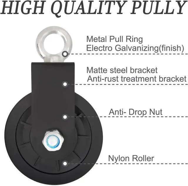 Premium Material - Super Mute SystemThe gym silent pulley is made of high-quality nylon material and the thickened steel plate outer bracket is made of carbon steel. With smooth, durable, wear resistance, corrosion-resistant, strong structure, strong load bearing, anti-rust and hard to deform features. Built in carbon steel ball bearings inside to reduce friction, which can reduce wheel friction to keep smooth and quiet. It can be used indoors or outdoors for a long time.