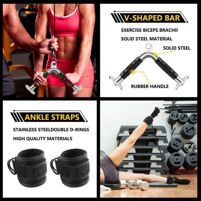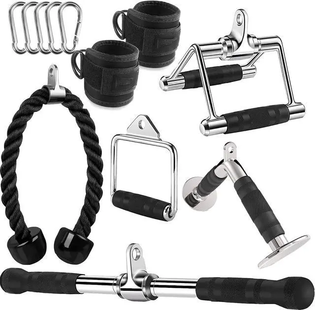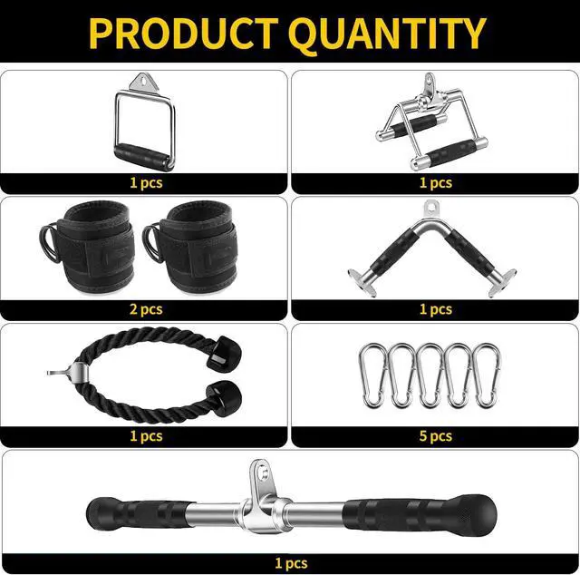 Includes: 1x Tricep Rope, 1x Double D Handle, 1x V-Shaped Bar, 1x Straight Rotating Bar, 1x Single D Handle, 2x Ankle Straps and 5 x Snap Hooks. These home gym accessories for men and women are designed to fit most cable systems.