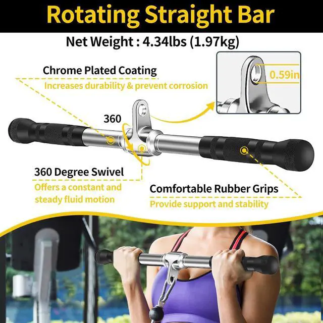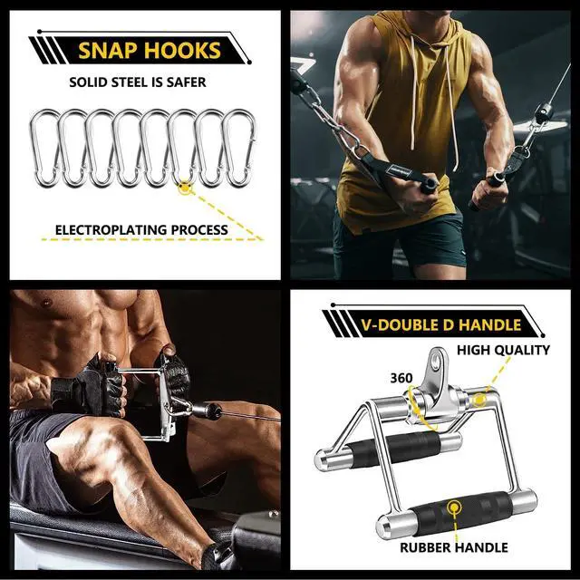 TOP PROCESS & MATERIALS - Cable machine attachment constructed of high-quality solid steel with polished chrome finish. 0.6 inch hole can fit easily for all cable system. Textured rubber coating handle, provides ergonomic & secured grip during workout, provides a balanced force to both arms when attach it to any gym machine.
