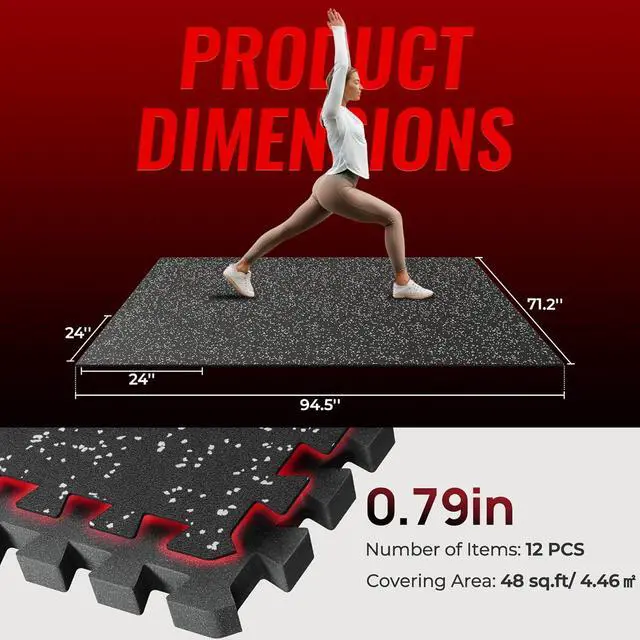 All Places Usable12 tiles, each with a thickness of 0.79 inch and a size of 24in x 24in, covers 48 Sq Ft. You can place this flooring mat wherever you need it! It' s suitable for a garage, gym, family fitness room or playroom.