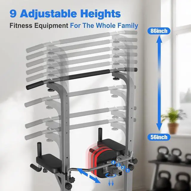 9 Adjustable HeightsThe pull up bar features reinforced steel tubing, making it more durable, with two ways to do pull-ups. With 9 adjustable heights, a lowest setting designed for children, the pull-up bar free-standing tower is perfect for the whole family to work out. 4 adjustable wide-fitted backrest settings cater to the whole family' s workout needs, providing added comfort for dips.