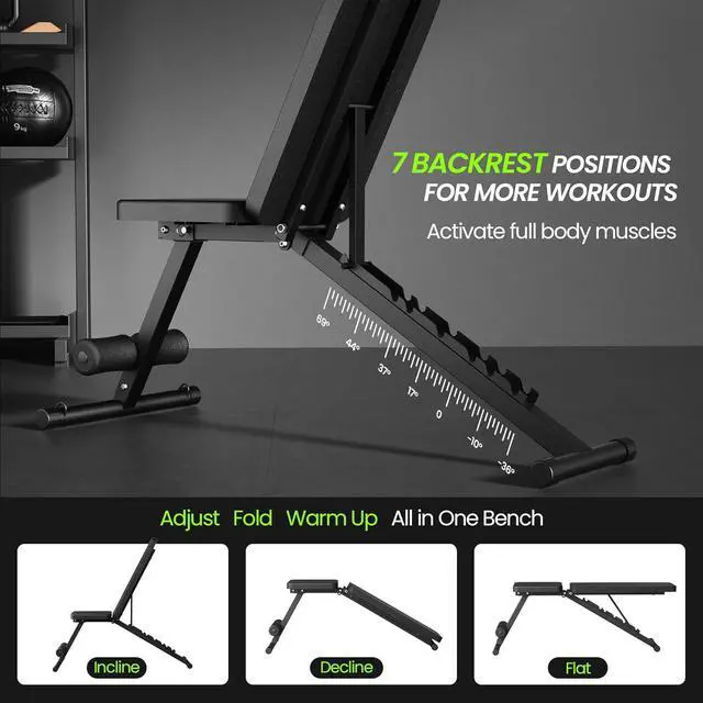 ADJUSTABLE WEIGHT BENCH - Flexible to adjust the backrest angle from 69°to -36°, this workout bench can be adjusted to three forms: Incline/Decline/Flat. Suitable for full body training in different postures according to your needs