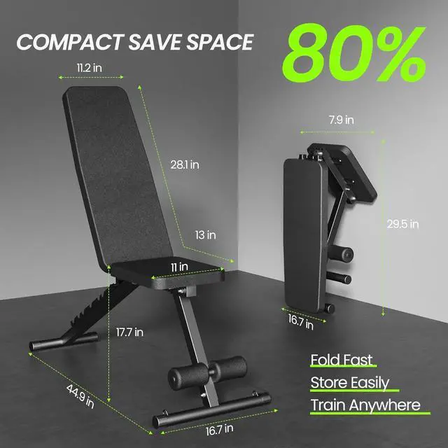 FAST FOLDING & SPACE SAVING - Pull out the two connecting pins to fold the gym bench in 3 seconds. Compact size measuring 16.7 " L x 7.8 " W x 29.5 " H after folded, saving 80% space. Exercise bench is portable and easy to move