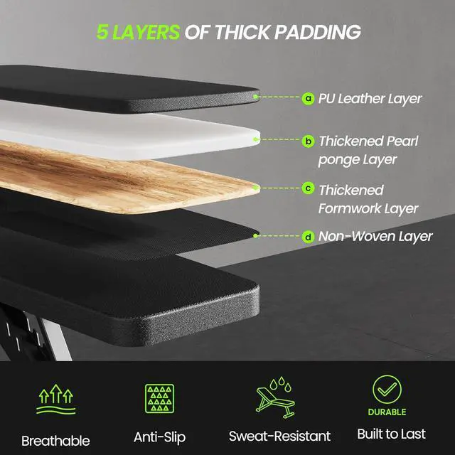 COMFORTABLE MATERIAL - The surface of weight bench is made of breathable leather, which is sweat-proof, anti-slip and easy to clean. High-quality & Eco-friendly foam padding to reduce muscle fatigue. Foldable weight bench is an ideal choice for home and gym