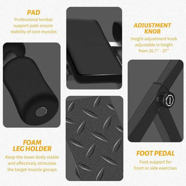Durable Construction Crafted from high-strength carbon steel with an anti-abrasive coating, this hyperextension bench offers cushioned support and foot pads for comfort. It supports up to 245 pounds, ensuring long-lasting durability in your home gym