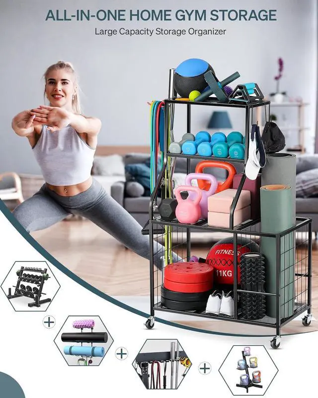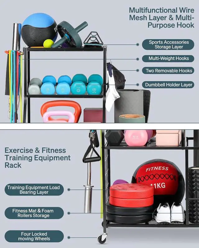UNIQUE DESIGN: Side storage yoga mat and foam roller, the other side is gravity hook can hang 60 lb fitness accessories. 4 layers rack can organize different fitness equipment as your need.