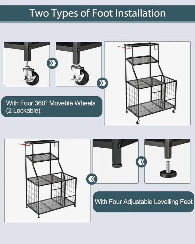 MOVING WHEELS & FOOT PAD: Home gym storage rack wheels roll well and strong load-bearing capacity, wheels can move and lock it. You can easily move the storage cart anywhere you want. Or assemble 4 foot pads, the stand will be more stable.