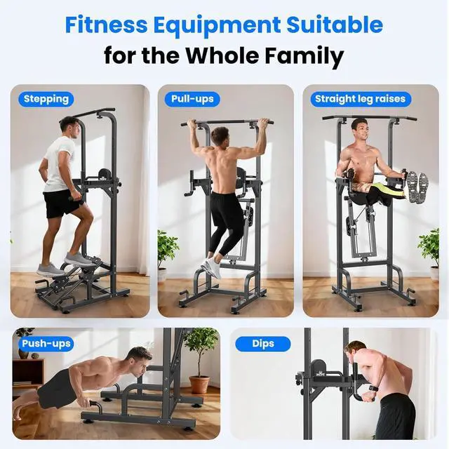 Sturdiness and Durability, Supports up to 450 lbs, safety locknut and 4 sturdy suction cups for added stability. The Relife power tower features a robust pull up bar and stays steady without any wobbling or shaking, providing confidence and safety during your workout, whether you' re doing pull-ups, push-ups, chin-ups, dips or other exercises.