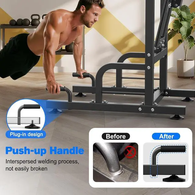 Thickened Quality Steel Pipe, The thicker steel tubing enhances the durability of the pull-up tower. The push-up bars are seamlessly integrated into the bottom steel tubing of the pull-up and dip station, improving stability and ensuring safety during workouts.