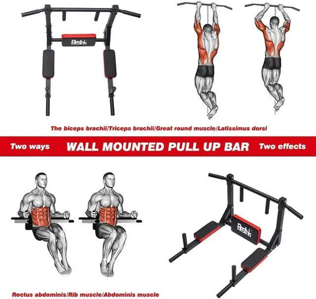 Gym Equipment: BESTHLS pull up bar wall mounted fitness equipment can be used for pull ups and dip ups exercises to achieve the goal of exercising different muscle groups.