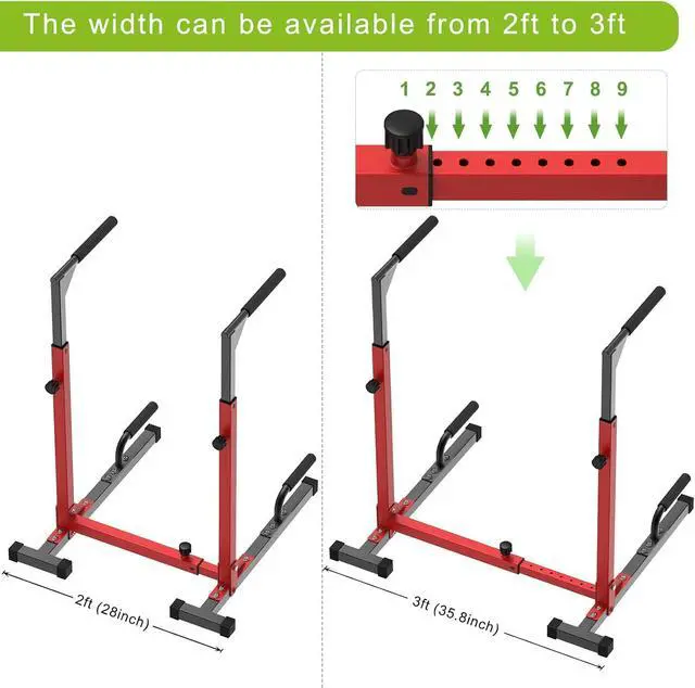adjustable width (9 levels: 2 to 2.5 feet) and height (7 levels: 3.3 to 4.3 feet), our dip stand meets the needs of different individuals and varying workout difficulties