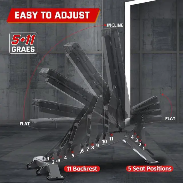 Adjustable Design: Enjoy 5+11 adjustable positions, our home gym heavy duty bench offers 11backrest positions and 5 seat positions, allowing for incline, flat, and decline configurations. Teclor weight bench allowing you to target various muscle groups and perform a wide range of exercises with ease