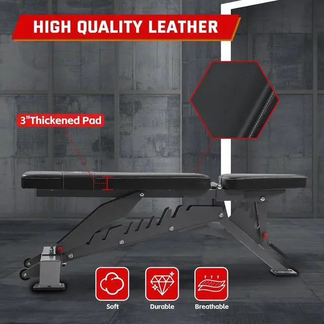 Comfort and Convenience: Made with soft leather and equipped with an adjustable seat cushion, this bench offers comfort during workouts and stability for every exercise