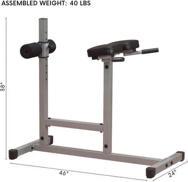 DIMENSIONS: The Body-Solid Roman Chair is built with commercial 2" x 3" heavy-gauge steel, ensuring a sturdy base that eliminates rocking during intense workouts. Measures 46" x24" x38" and weighs 40lbs. Ideal for home and commercial use.